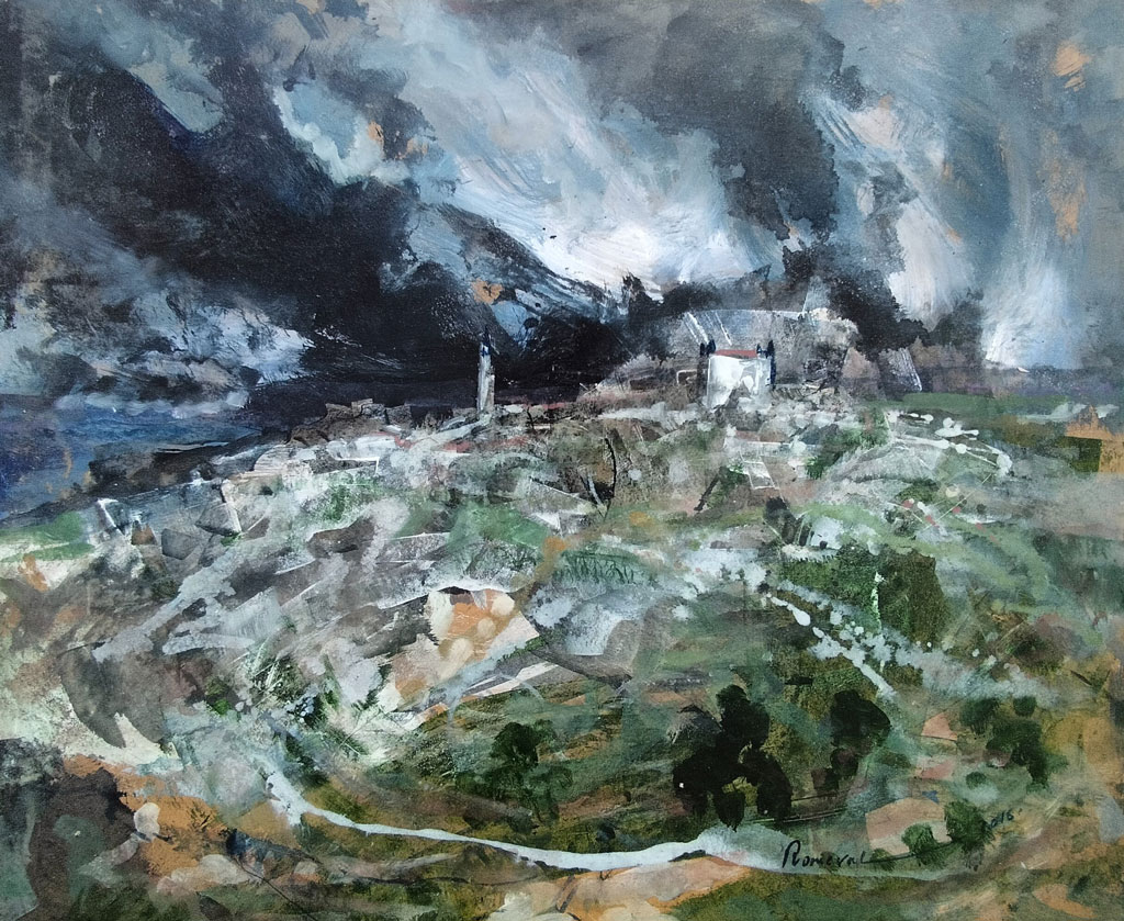 La muestra de pintura está distribuida entre el claustro superior y las dos salas laterales; en la sala izquierda se acogen setenta y cuatro pigmentos sobre lija, obras de pequeño formato y diez impresiones digitales T.P.A. (tocadas por el artista), con una instalación de varios elementos que han propiciado esta etapa de «las lijas», fuente de inspiración de la obra del pintor.