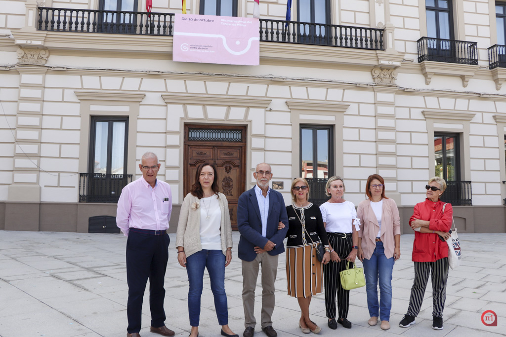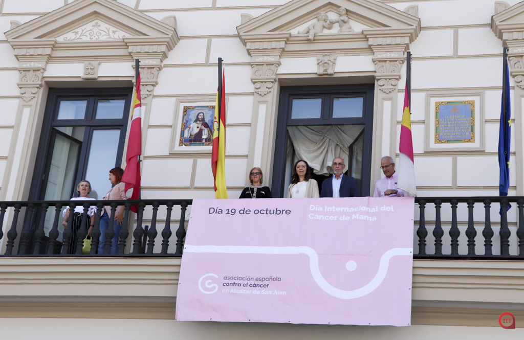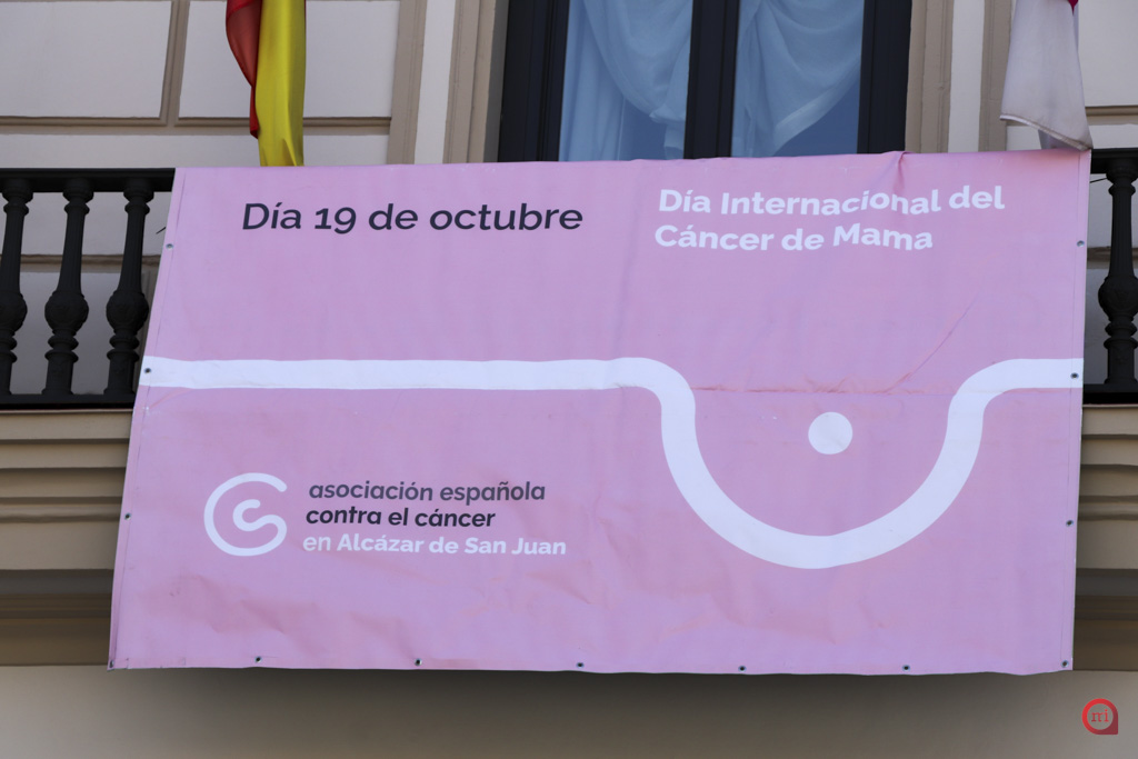 Adelantándose a la conmemoración del Día Mundial del Cáncer de Mama, el miércoles 19 de octubre, la alcaldesa de Alcázar de San Juan, Rosa Melchor, junto con el presidente de la junta local de la AECC, Enrique Lubián, y miembros de la entidad, han desplegado la bandera rosa en el balcón del Ayuntamiento alcazareño.