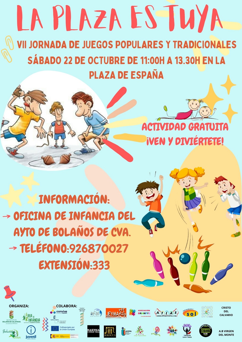 Los niños y jóvenes de Bolaños tienen una nueva cita este sábado, 22 de octubre, en la Plaza de España con la VII Jornada de Juegos Populares y Tradicionales ‘La plaza es tuya’, una iniciativa impulsada por la concejalía de Infancia y la concejalía de Juventud del Ayuntamiento de Bolaños de Calatrava y con la colaboración de la Fundación Cepaim, bajo el programa para la promoción y la convivencia intercultural en el ámbito educativo, y el tejido asociativo del municipio.