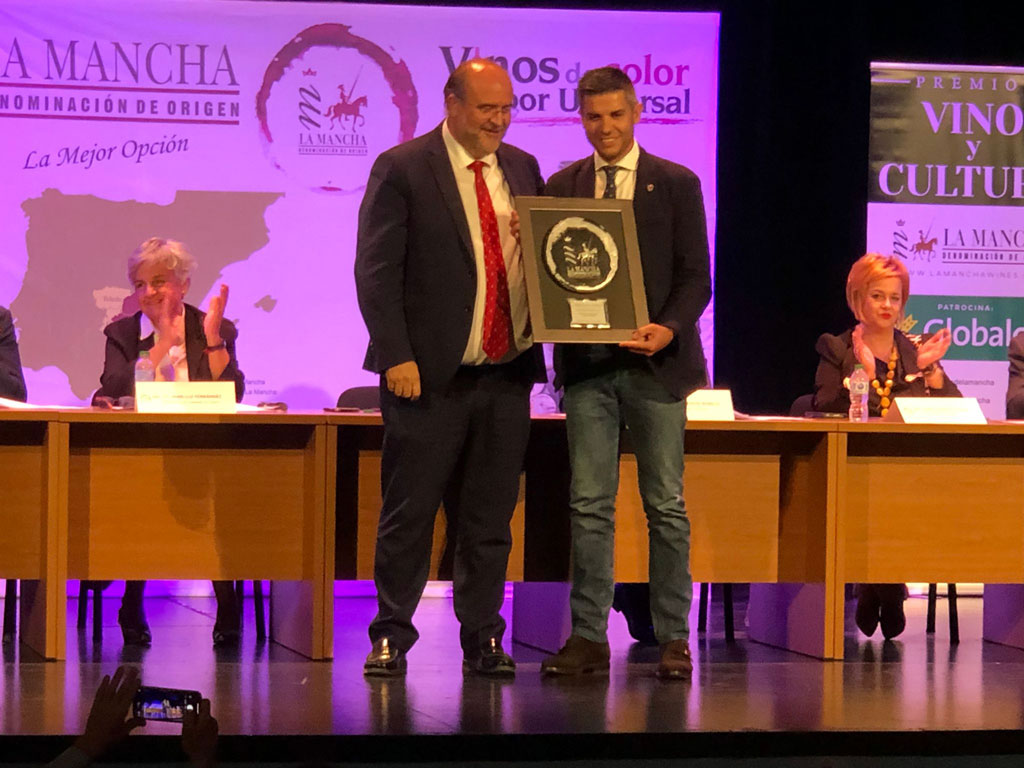 El alcalde de Campo de Criptana, Santiago Lázaro, recogía de manos del vicepresidente regional, José Luis Martínez Guijarro, el premio ‘Iniciativa Enoturística’ del Consejo Regulador de la DO La Mancha en el marco de los Premios Vino y Cultura 2022.