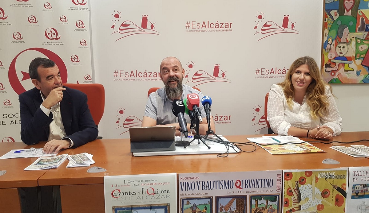 Este jueves, 27 de octubre, han sido presentadas oficialmente en el Ayuntamiento de Alcázar de San Juan las Jornadas de Vino y Bautismo Qervantino, que se celebrarán en la ciudad desde el día 3 de noviembre y que contarán como gran novedad con el Congreso “Cervantes y el Quijote desde Alcázar”. El concejal de Cultura Mariano Cuartero, la concejala de Turismo Bárbara Sánchez-Mateos y el presidente de la Sociedad Cervantina de Alcázar, Juan Bautista-Mata, han presentado la cita en la Sala de Comisiones del Consistorio alcazareño.