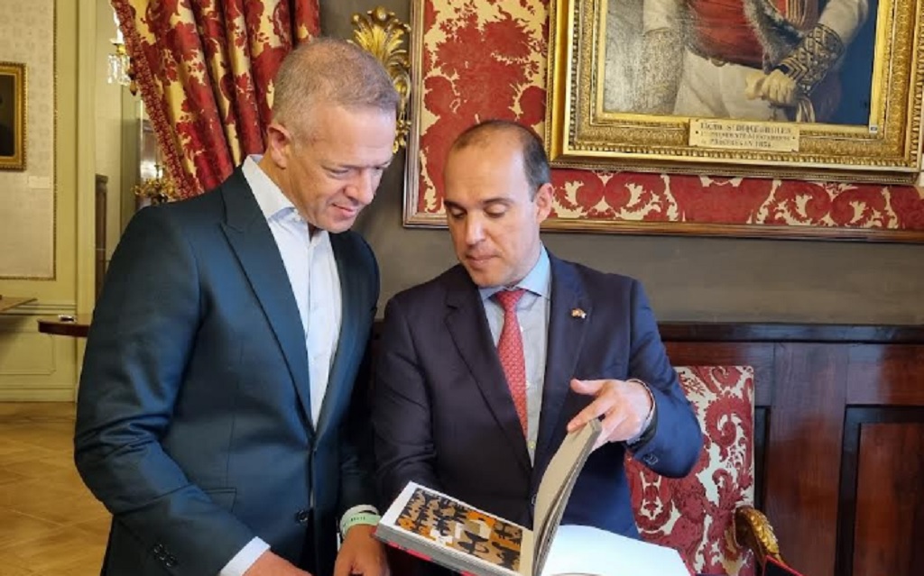 El presidente de las Cortes de Castilla-La Mancha, Pablo Bellido, ha hecho entrega de un ejemplar conmemorativo del 40 aniversario del Estatuto de Autonomía de Castilla-La Mancha al presidente del Senado, Ander Gil, durante un encuentro que ambos han mantenido este jueves en los despachos de Honor de esta cámara en Madrid.