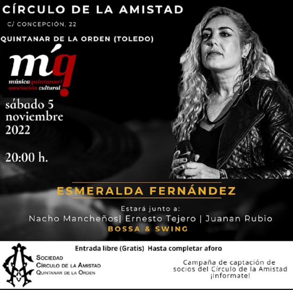 El grupo BOSSA & SWING estará en el Salón principal del Círculo de la Amistad de Quintanar de la Orden en un concierto que contará con la inestimable colaboración de la artista Esmeralda Fernández, una de las voces más potentes y personales con las que se cuenta actualmente en Quintanar