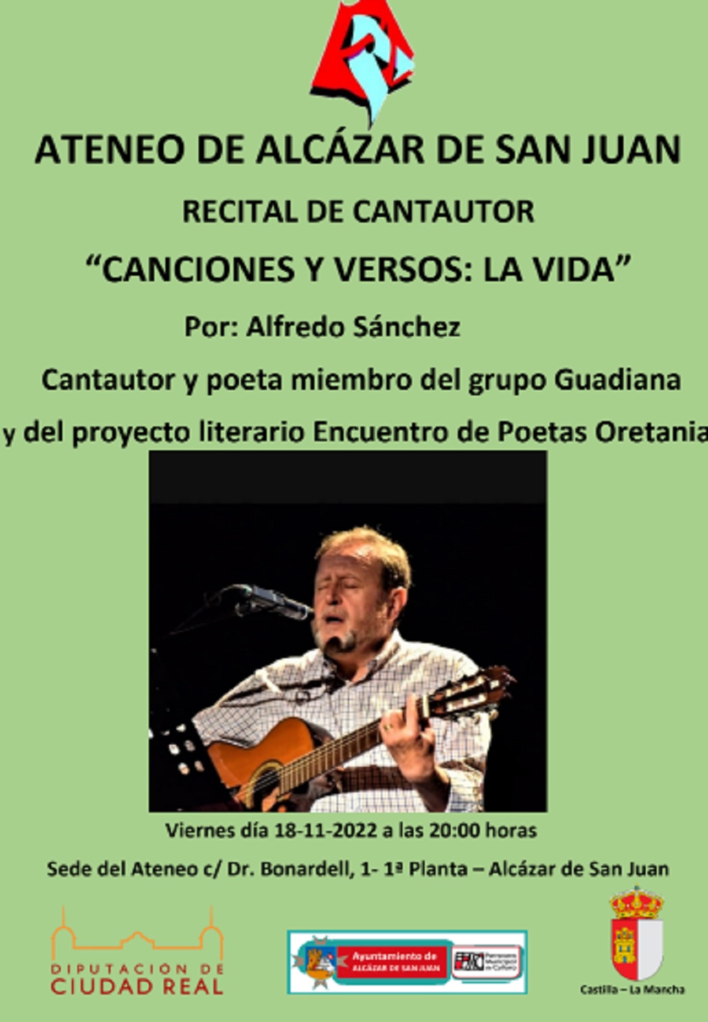 El cantautor y poeta Alfredo Sánchez protagonizará el recital “Canciones y Versos: La vida” este viernes día 19 de noviembre en Alcázar de San Juan. Es miembro del grupo Guadiana y del proyecto literario “Encuentro de Poetas Oretania”. El recital tendrá lugar en la Sede del Ateneo de Alcázar de San Juan, el viernes día 18 de enero, a las 20:00 h.