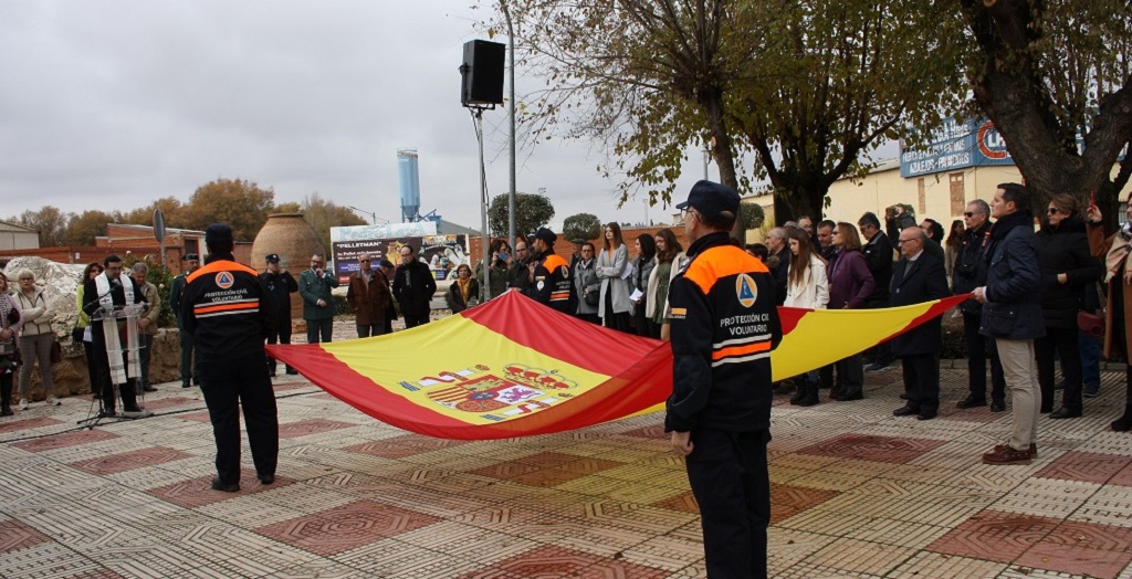 Tras ello, el párroco de Miguel Esteban, Juan Antonio López, ha bendecido la bandera antes de proceder a su izado, función que ha correspondido a representantes de la Policía Local y la Guardia Civil. Los voluntarios de Protección Civil han custodiado y aproximado la bandera hasta el mástil acompañados por el concejal de Empleo y Promoción Económica, Marcelino Casas, en representación de la Corporación Municipal.