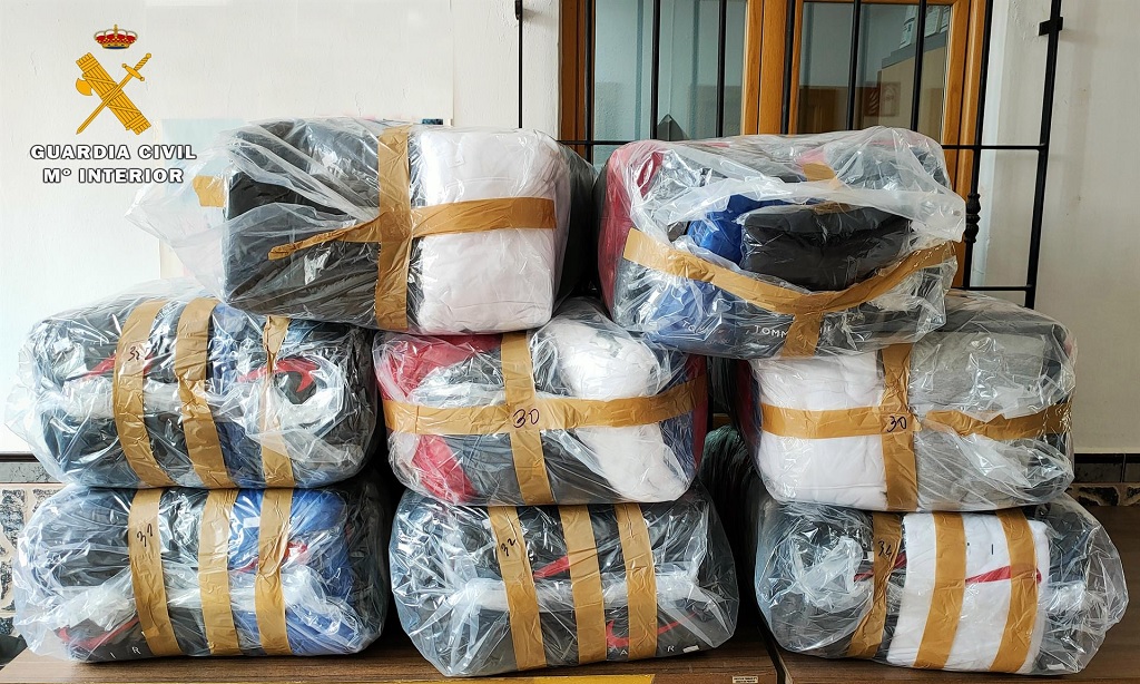 En ese preciso momento, los agentes de la Guardia Civil que seguían el envío identificaron al receptor de la mercancía, siendo requerido para que mostrara el contenido de los cuatro bultos que acaba de recibir, comprobando tras su desembalaje que conformaban ocho paquetes que contenían un total de 248 prendas de vestir, concretamente sudaderas, supuestamente réplicas de una marca registrada, que a simple vista generaban serias dudas sobre su autenticidad.