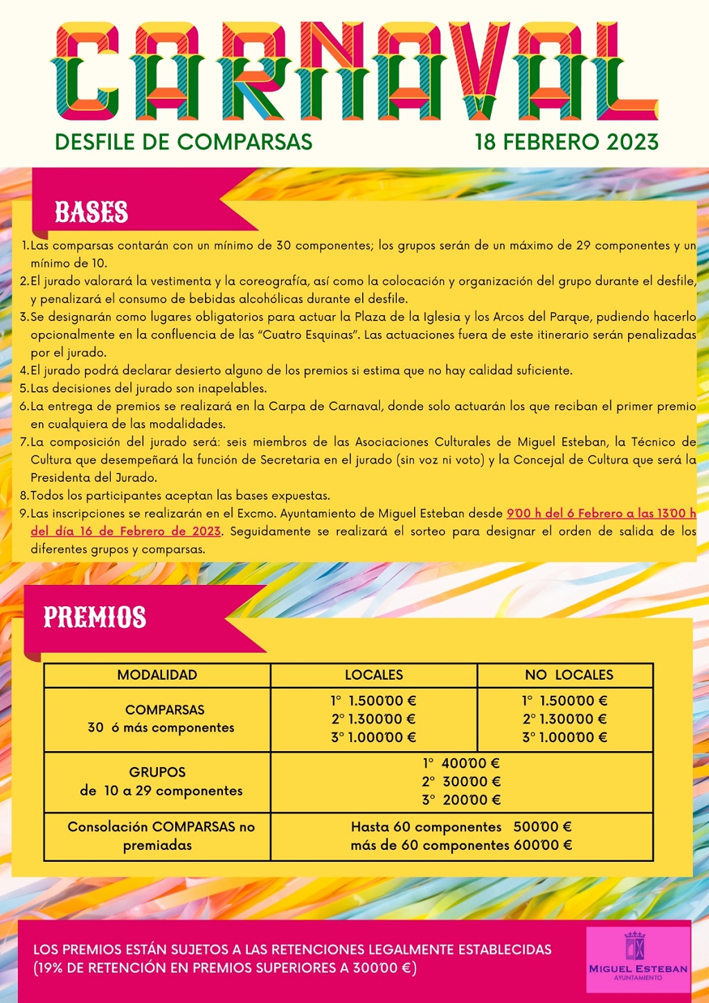 Las inscripciones podrán realizarse en el edificio del Consistorio desde el 6 hasta el 16 de febrero en horario de 09:00 a 13:00 horas. Una vez cerrado el plazo, la organización realizará el sorteo para designar el orden de salida de los grupos y comparsas participantes.