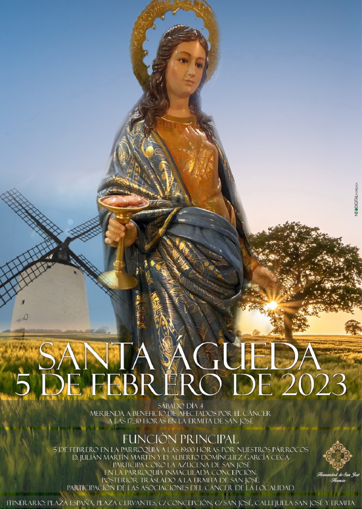 La Hermandad de San José de Herencia ha programado actos religiosos y solidarios para celebrar a Santa Águeda este fin de semana. El día 5 de febrero será la función principal en la parroquia a las siete de la tarde, con la participación del coro La Azucena de San José. Acto seguido, será el traslado de la imagen hasta la ermita con la participación de la AECC de la localidad.