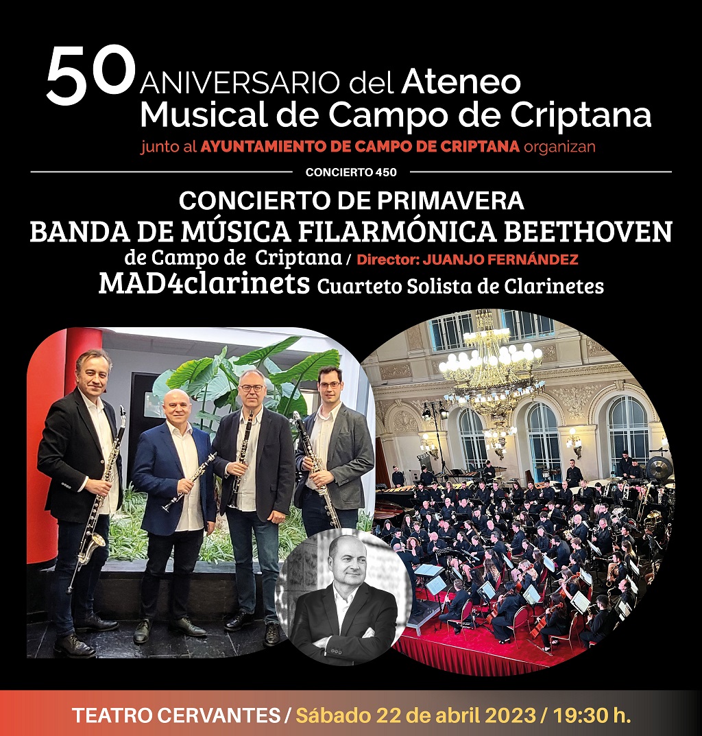 El próximo sábado 22 de abril a las 19:30 h. en el Teatro Cervantes, el Ateneo Musical de Campo de Criptana organiza junto al ayuntamiento de Campo de Criptana el Concierto de Primavera: Banda de Música Filarmónica Beethoven de Campo de Criptana bajo la dirección de Juanjo Fernández y Mad4clarinets como solistas Interpretarán dos conciertos escritos para cuarteto de clarinetes solistas y Banda. Estos cuatro excelentes músicos, además y en colaboración con el Conservatorio de música, realizarán masterclass aprovechando su visita para los ensayos del concierto.