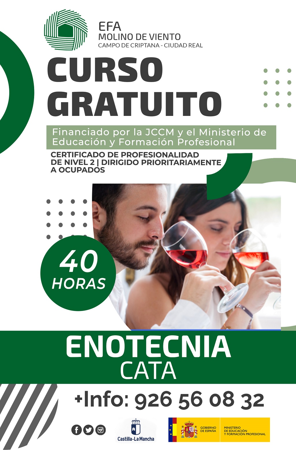 La EFA Molino de Viento de la localidad ciudadrealeña de Campo de Criptana está organizando un curso de cata de vinos de 40 horas de duración. Se trata de un curso financiado por el Ministerio de Empleo y la Junta de comunidades, por tanto gratis, destinado fundamentalmente a ocupados, según ha informado el centro educativo en un comunicado.