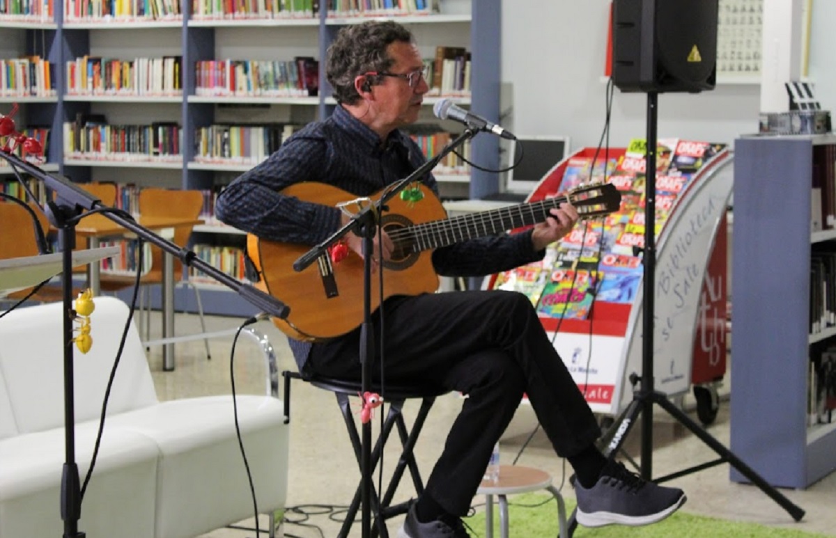 Es cantautor y autor de cuatros discos. Acaba de sacar el último y todos ellos que sigue teniendo relación con la poesía. Por ello, el sitio habitual donde realiza sus conciertos suele ser en bibliotecas.
