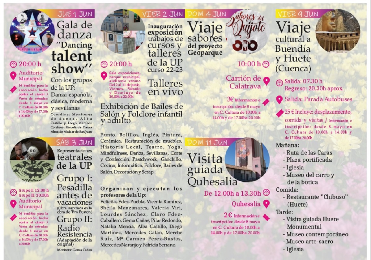Para ello, se presenta un programa con diferentes eventos para disfrutar del talento, ingenio y creatividad, dejando evidencia del trabajo realizado durante el curso. La primera cita la encontramos el jueves 1 de junio con la Gala Danza “Dancing talent show” y la participación de los grupos de Danza Española, Clásica, Moderna y Sevillanas. El día siguiente, tendrá lugar la inauguración de la exposición de trabajos, con talleres en vivo y exhibiciones de Bailes de Salón y Folclore. Durante el primer fin de semana de junio, la representaciones teatrales de los grupos de la Universidad Popular pondrán el colofón a las muestras en directo en el Auditorio Municipal.