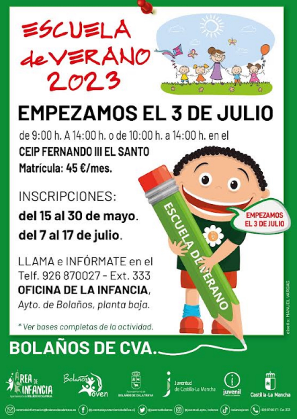 La Escuela de Verano, que un año más organiza el Ayuntamiento de Bolaños desde el área de Infancia en el CEIP Fernando III El Santo, va dirigida a niños y niñas con el fin de desarrollar su dimensión física, psíquica, cultural y social mediante diversos juegos y actividades que promuevan la educación en valores y la formación de los más pequeños mientras se divierten y aprenden a constituir su tiempo de ocio mediante alternativas que favorecen su desarrollo.