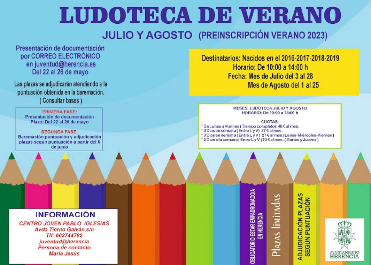 El Ayuntamiento de Herencia ofrece una edición más, el programa de Ludoteca de Verano, destinado a familias con niños y niñas de entre 4 a 7 años, y que durante los meses de julio y agosto, quieran participar en este programa educativo y de gran ayuda para la conciliación laboral. Por este motivo, y debido a su éxito en ediciones anteriores, se va a abrir una tercera clase para dar respuesta a la numerosa demanda.