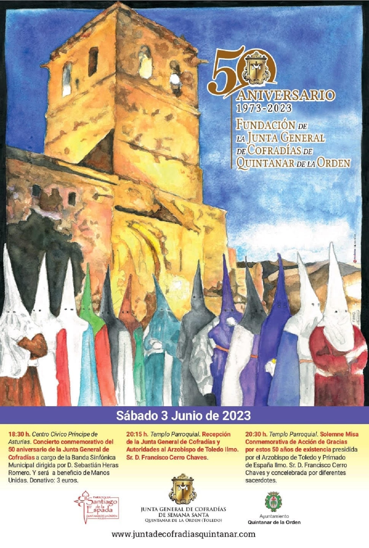 El próximo 3 de junio, la Junta General de Cofradías de Quintanar de la Orden va a celebrar el día de acción de gracias por su 50 Aniversario Fundacional, con motivo de ello tiene previstos los actos indicados en el cartel adjunto. Tiene previstos los siguientes actos: