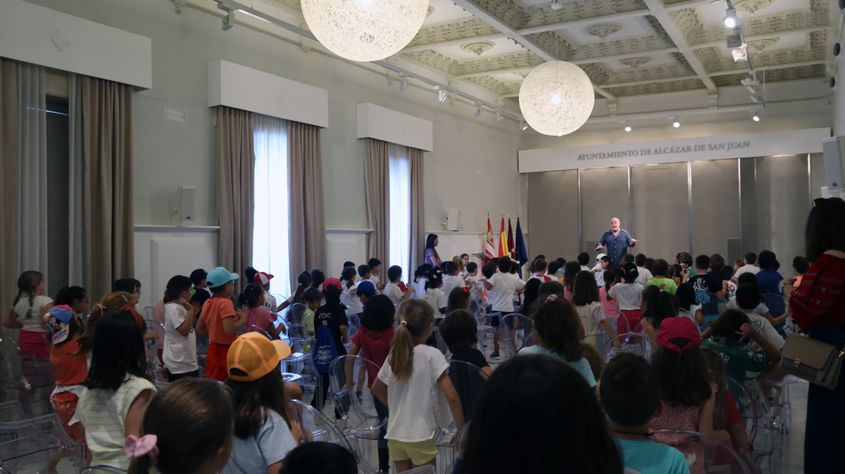 Esta mañana, en el Salón Noble del Ayuntamiento, el reconocido narrador oral Aldo Méndez cautivaba a la comunidad educativa con su espectáculo titulado «Cuentamañanas: Un paseo de cuentos por Alcázar de San Juan». Este evento forma parte de un taller desarrollado por Méndez como parte integral del Plan Municipal de Cultura, el cual ha involucrado a diversos agentes culturales y educativos de la ciudad en una enriquecedora experiencia didáctica centrada en el arte de contar cuentos. El concejal de Cultura, Mariano Cuartero, estuvo presente durante la cita.