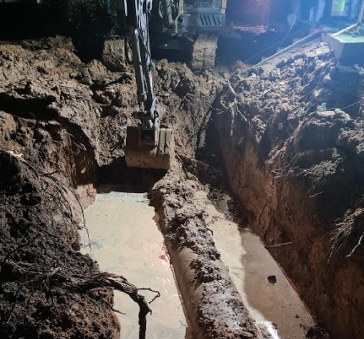 La zona donde se produjo la rotura presentaba dificultades de acceso debido a la presencia de árboles y edificaciones en una parcela vallada. Para superar este obstáculo y garantizar el éxito de la operación, se utilizaron dos retroexcavadoras y una excavadora giratoria con cadenas, junto con un camión para el traslado de materiales y maquinaria. Además, se instalaron dos bombas de gran caudal en los puntos más bajos del tramo afectado para acelerar el desagüe.