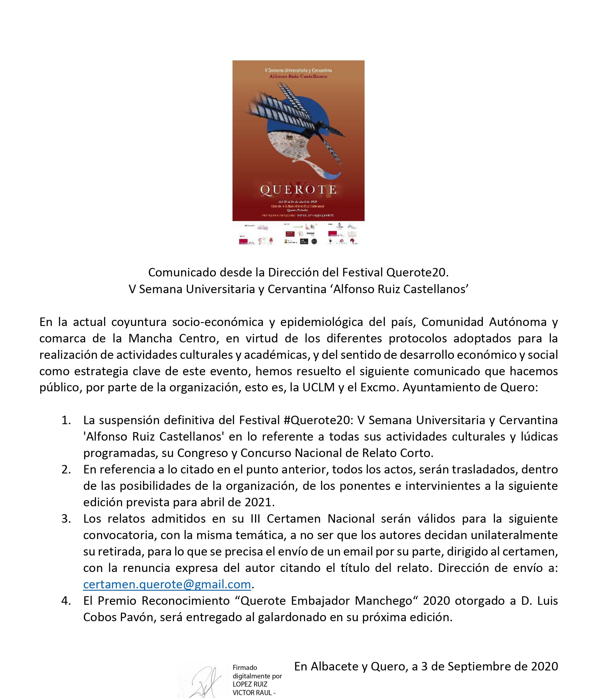 El Ayuntamiento de Quero, la Universidad de Castilla-La Mancha y la organización del festival Querote 2020 han informado, a través de un comunicado, la suspensión definitiva de la edición de este año debido a la crisis del coronavirus. El comunicado es el siguiente: