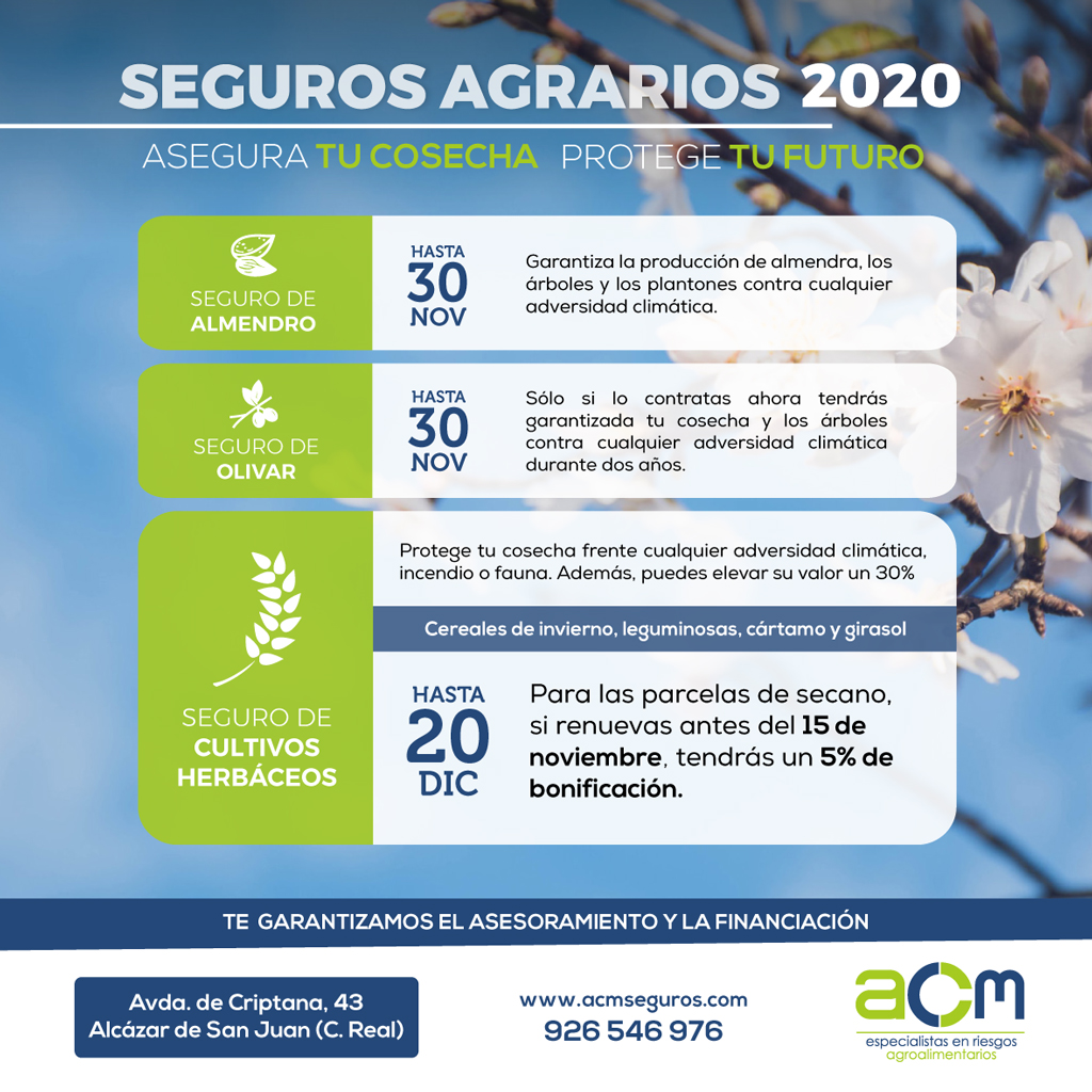 En ACM seguros estamos orgullosos de las garantías que ofrece nuestro sistema español de Seguros Agrarios. Por lo que metidos ya en campaña de contratación de seguros agrarios para la cosecha 2021, animamos a todos los agricultores a que pregunten sobre la forma de suscribir y las opciones que tienen para cubrir todo tipo de adversidad climática, tanto en las Cooperativas Agroalimentarias que colaboran con ACM Seguros como en toda la red técnicos adheridos a ACMseguros.com