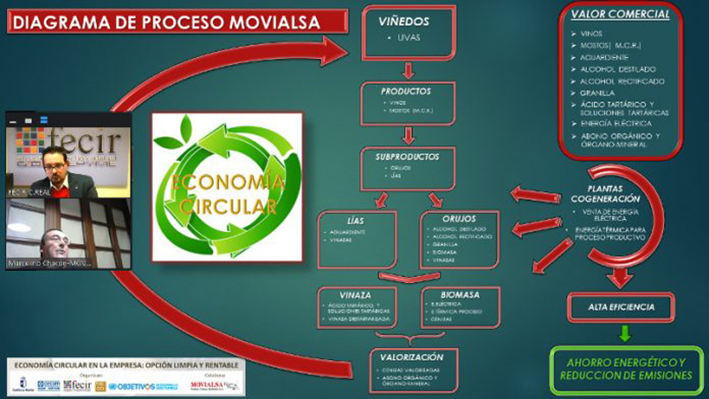 Para contribuir en la difusión de esta interesante, a la vez que necesaria práctica en nuestras empresas, la Federación Empresarial de Ciudad Real (FECIR) ha organizado, para el próximo día 10 de noviembre, la Jornada Gratuita ON LINE «Economía Circular en la Empresa: Opción Limpia y Rentable», donde dará a conocer, a través de la experiencia particular de la empresa MOSTOS, VINOS Y ALCOHOLES, S.A (MOVIALSA), las oportunidades que la ECONOMIA CIRCULAR ofrece a empresas de nuestra Provincia.
