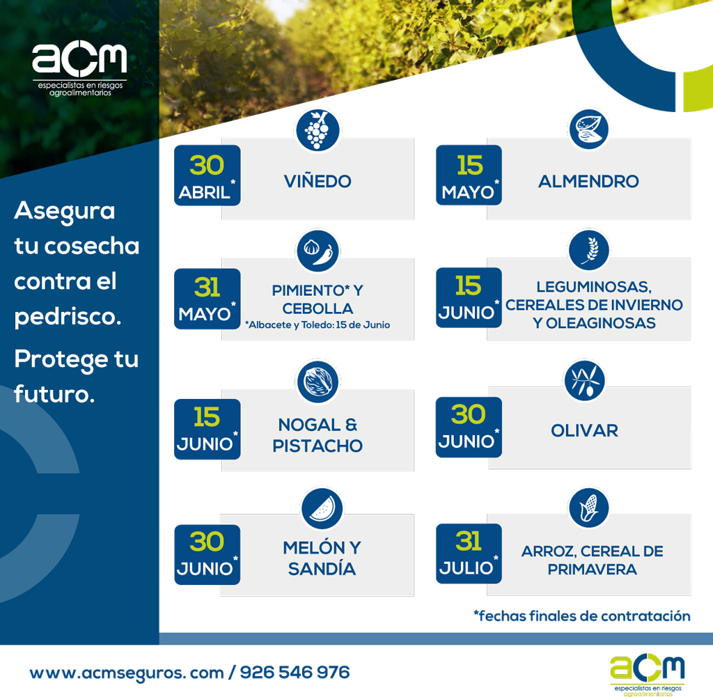Para todos aquellos cultivadores de almendra, cultivo que tanto está creciendo, les informamos que, si se han librado de la helada del pasado domingo 21, cubiertas también por el seguro agrario, podrán contratar cobertura de pedrisco hasta el 15 de mayo, pudiendo pagar también el lunes 17 de mayo.