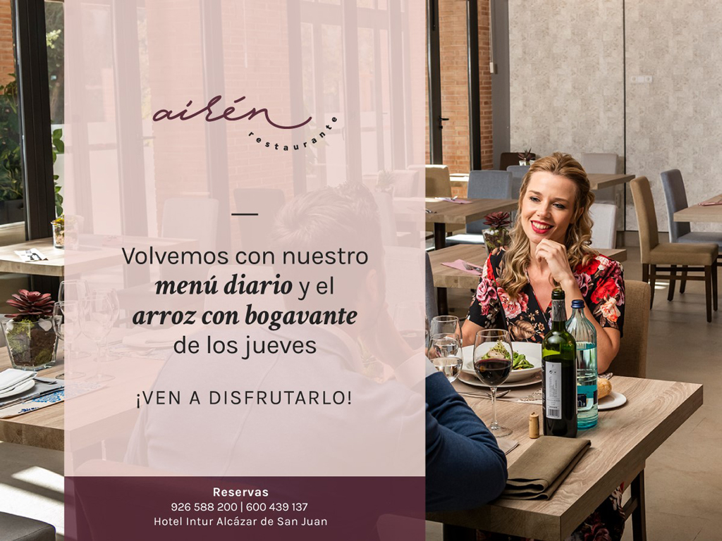 El restaurante Airén del Hotel Intur de Alcázar de San Juan (Ciudad Real) recupera los menús de esta primavera-verano, todo un emblema gastronómico en toda la comarca. El menú tiene un precio de 14,70 euros y se pueden elegir entre seis primeros platos, seis segundos y seis postres. El menú incluye agua mineral, vino, una copa de cerveza o un refresco.