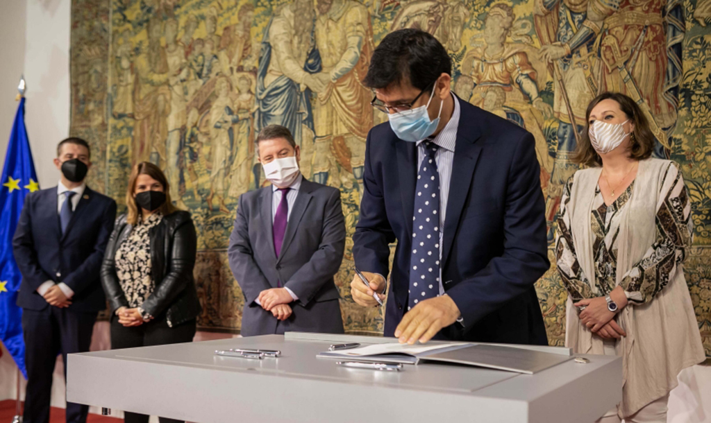 El presidente de la Diputación de Ciudad Real, José Manuel Caballero, ha firmado esta mañana, junto al presidente del Gobierno regional, Emiliano García Page, la consejera de Economía, Patricia Franco y el resto de presidentes de diputaciones de Castilla-La Mancha, el convenio del nuevo plan de empleo de la Junta de Comunidades, que en esta edición cuenta con una inversión total en la provincia de 35 millones de euros.