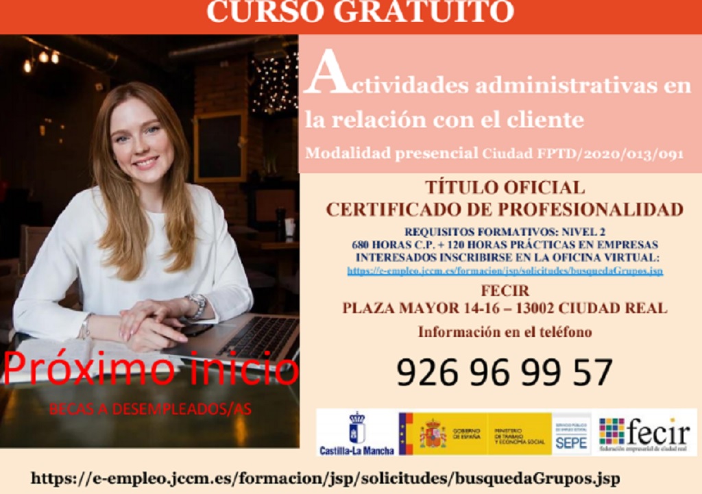 En breves días dará comienzo la acción formativa gratuita sobre ‘Prácticas en empresas y posibilidad de becas: actividades administrativas en la relación con el cliente’, que será impartido en Ciudad Real, con una duración de 680 horas más 120 de prácticas en empresas. El curso finalizará el 30 de noviembre y, a partir de esa fecha, comenzarán dichas prácticas.