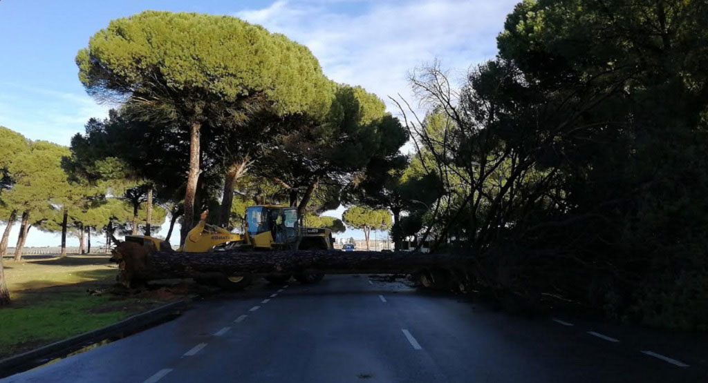 El Ayuntamiento de Arenales de San Gregorio ha comunicado la caída de un pino de la zona de la travesía de la carretera provincial CR-1222 que atraviesa la localidad, justamente enfrente del paseo del parque municipal, lo que cortó momentáneamente el tráfico por la misma.