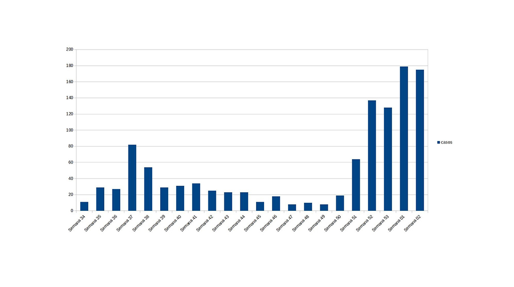 Aunque el número de nuevos casos sigue siendo muy alto y prácticamente similar al de la semana anterior, el incremento exponencial que venía registrándose en Manzanares desde primeros de diciembre se ha frenado en la semana 2, que deja 175 nuevos casos, cuatro menos que en la semana 1, que sigue marcando la cresta de esta tercera ola en la localidad.