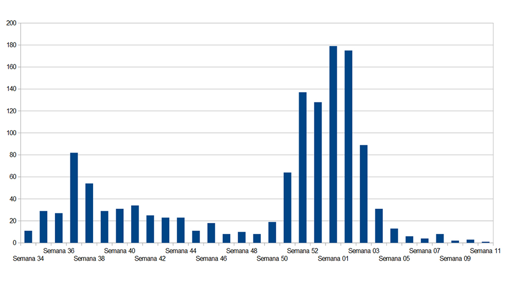 De esta forma, los casos por cada 100.000 habitantes pasan de los 16’7 de la semana 10 a los 5’57 en la semana 11.