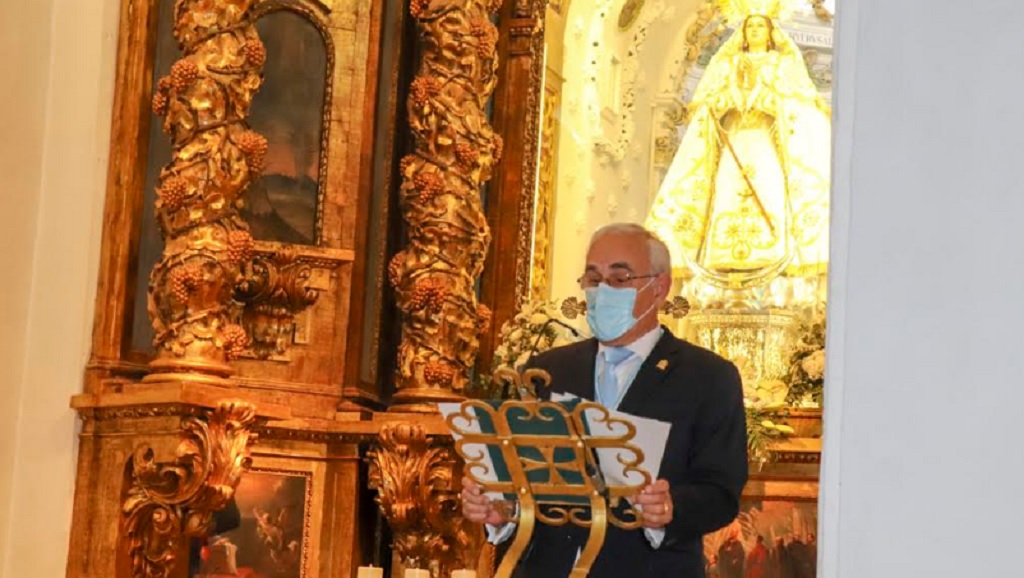 En este año el encargado de pedir la licencia y pregonero ha sido Rafael Castellanos Manzanares que ha destacado que se trata de un día especial para él, ya que el año pasado no puedo realizar el pregón y este año sí que ha sido posible con público asistente, a través de las redes sociales y medios de comunicación. Castellanos ha destacado que “es un momento para mí de mucho orgullo y mucha responsabilidad”, ya que ha confirmado que va a relatar quién trajo la imagen de la Virgen a Alcázar y en qué año, además de dónde. Castellanos ha destacado que ha estado buscando en los escritos de la gente de nuestra tierra “y he encontrado cosas muy bonitas para decirle a la Virgen”. Castellanos ha afirmado acordarse mucho de su madre que fue la que le inculcó el amor a la Virgen; ha estado colaborando en la Archicofradía de la Virgen del Rosario cerca de 40 años “y bueno, no me he ido”, afirmando que la Virgen lo es todo para él.