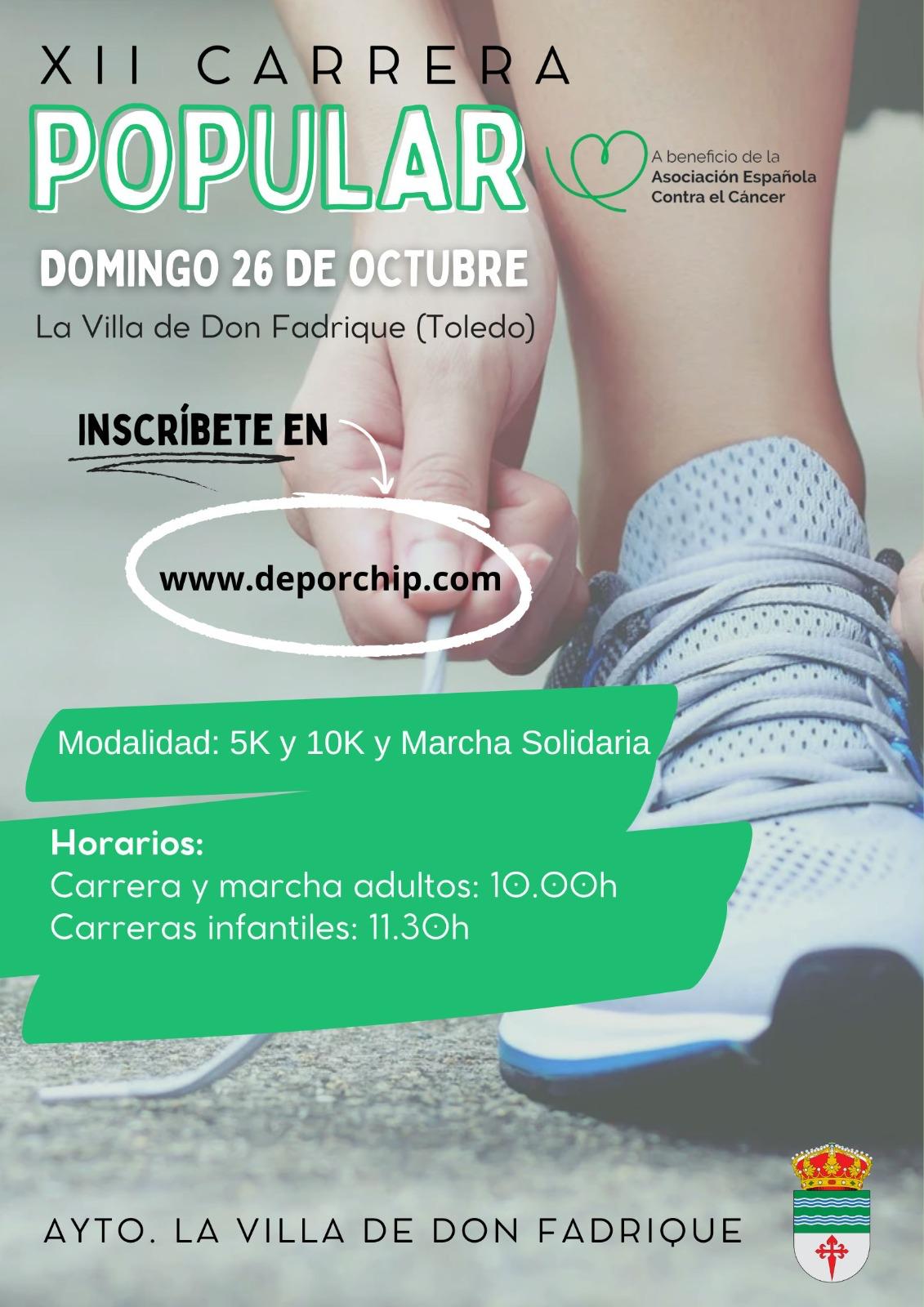 El próximo domingo, 26 de octubre de 2024, a partir de las 10 de la mañana, tendrá lugar la XII Carrera Popular Solidaria contra el Cáncer en La Villa de Don Fadrique. El plazo de inscripciones está abierto hasta el sábado, 25 de octubre, y se puede realizar online, en el Ayuntamiento de 17:00 a 20:00 horas ese mismo día, y también el día de la prueba desde las 8:30 hasta media hora antes de su comienzo.