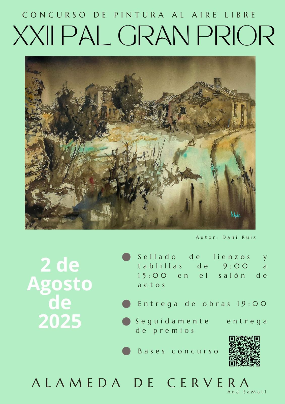 Seguidamente, el 2 de agosto, está convocada la XXII edición del Concurso de Pintura al Aire Libre (PAL) Gran Prior de Alameda de Cervera. Todo aquel que lo desee, puede participar en la entrega de premios tanto a nivel particular como de empresa.