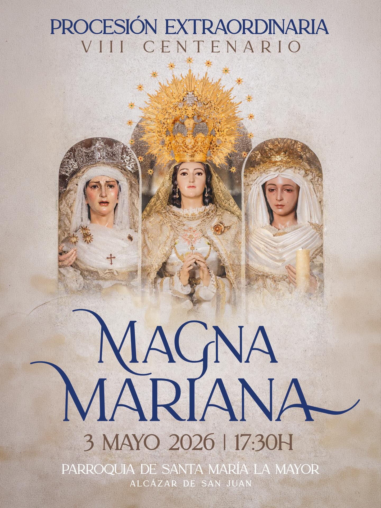 Alcázar de San Juan se prepara para vivir una jornada histórica con la celebración, el próximo 3 de mayo, de una procesión extraordinaria Magna y Mariana con motivo del VIII Centenario de la Parroquia de Santa María La Mayor. La cita reunirá a tres de las grandes devociones marianas de la ciudad: la Virgen del Rosario, Patrona de Alcázar, junto a la Virgen de la Soledad y la Virgen de la Salud, en un acontecimiento que también conmemora el 75º y 25º aniversario fundacional de estas dos últimas hermandades.