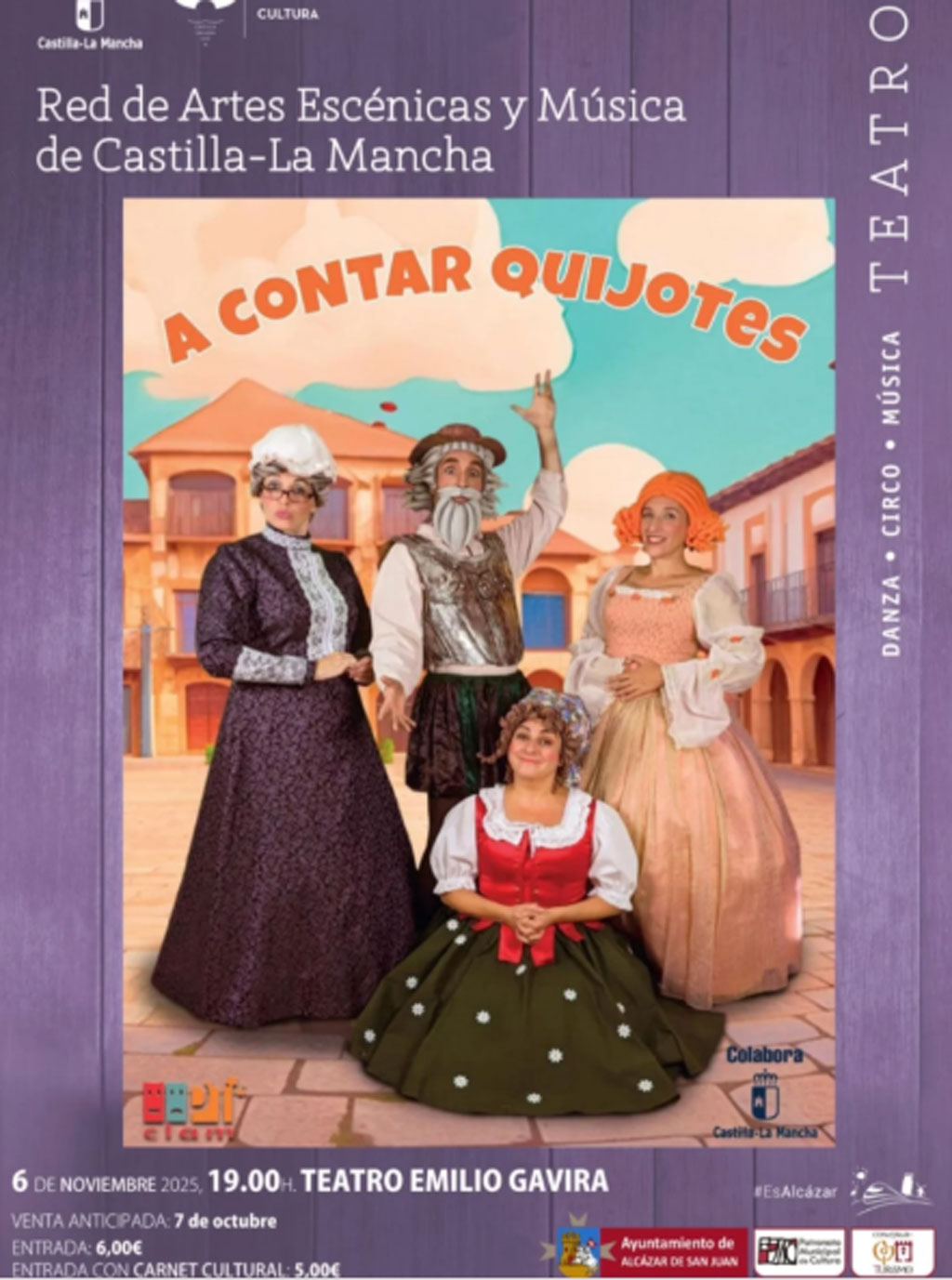La Red de Artes Escénicas y Música de Castilla-La Mancha, en colaboración con el Área de Cultura del Ayuntamiento de Alcázar de San Juan, programa la representación de “A contar quijotes” en el Teatro Emilio Gavira. La función tendrá lugar el próximo 6 de noviembre, a las 19:00 horas, y está dirigida principalmente a escolares de los centros educativos de la localidad.
