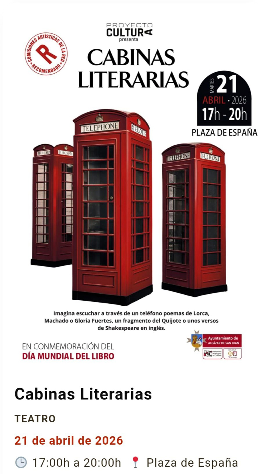 La Plaza de España de Alcázar de San Juan se convertirá el próximo 21 de abril en un espacio cultural diferente con la llegada de Cabinas Literarias, una propuesta que une teatro, poesía y experiencia sensorial en pleno corazón de la ciudad.
