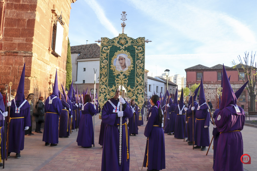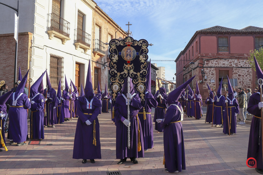 El Viernes Santo, día grande de la Semana Santa de Alcázar de San Juan, amaneció con una estampa primaveral que acompañó la salida procesional de Nuestro Padre Jesús Nazareno y María Santísima de los Dolores. A las 6:30 de la mañana, desde la Iglesia de la Santísima Trinidad, daba comienzo esta multitudinaria estación de penitencia, enmarcada por los primeros rayos de sol y un cielo salpicado de nubes blancas que realzaban aún más la solemnidad del momento.