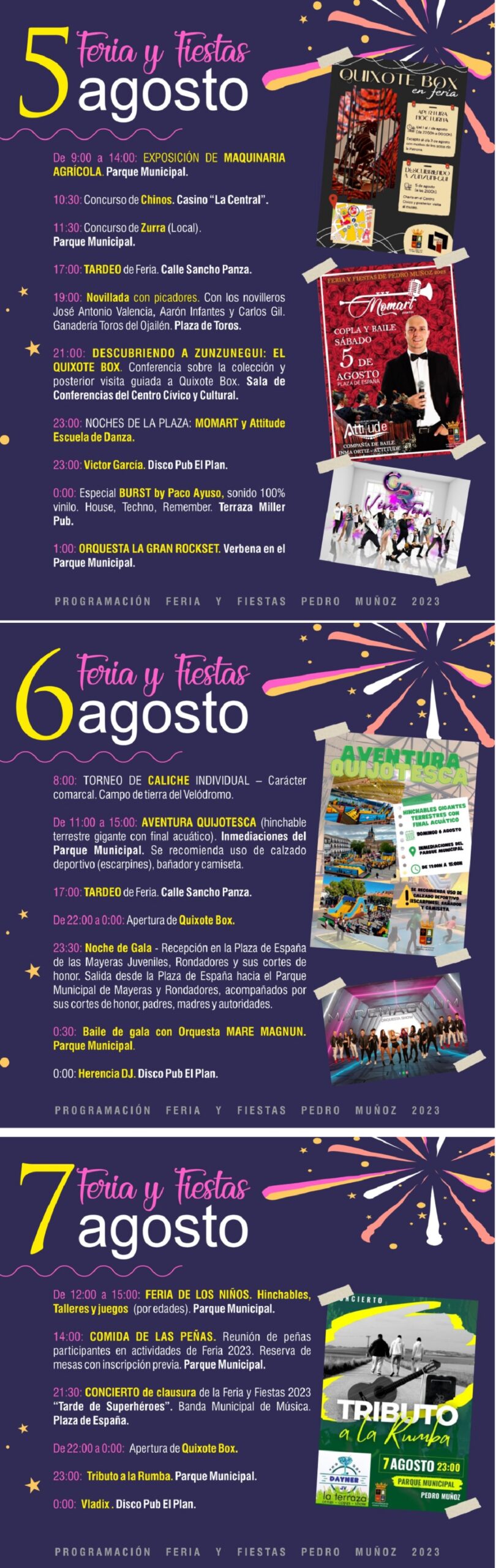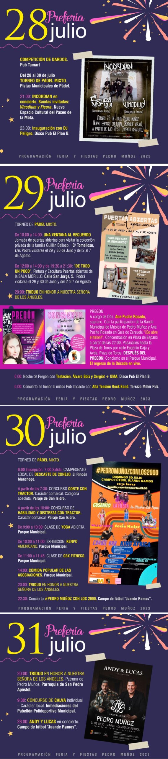 El grueso de las actividades de preferia también competerá al domingo, ya que hay programados distintos concursos y clases para todas las edades y gustos, en una jornada coronada con el concierto de los 2000. Y, en la noche del lunes, llega también la esperada cita musical de Andy y Lucas en el campo de fútbol “Juande Ramos”.