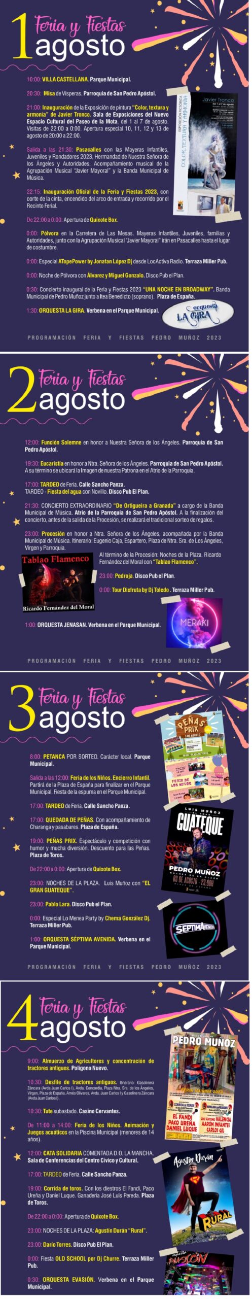 Pedro Muñoz se prepara para la celebración de su Feria y Fiestas en honor a Nuestra Señora de los Ángeles, los días más importantes en el municipio junto a los del Mayo Manchego. La nueva Corporación municipal, dirigida por Alberto Lara, tiene todo a punto para que este fin de semana se lleven a cabo los prolegómenos de unos días entrañables en los que los vecinos disfruten y visitantes y ausentes regresen a la localidad manchega con el fin de crear un gran ambiente.