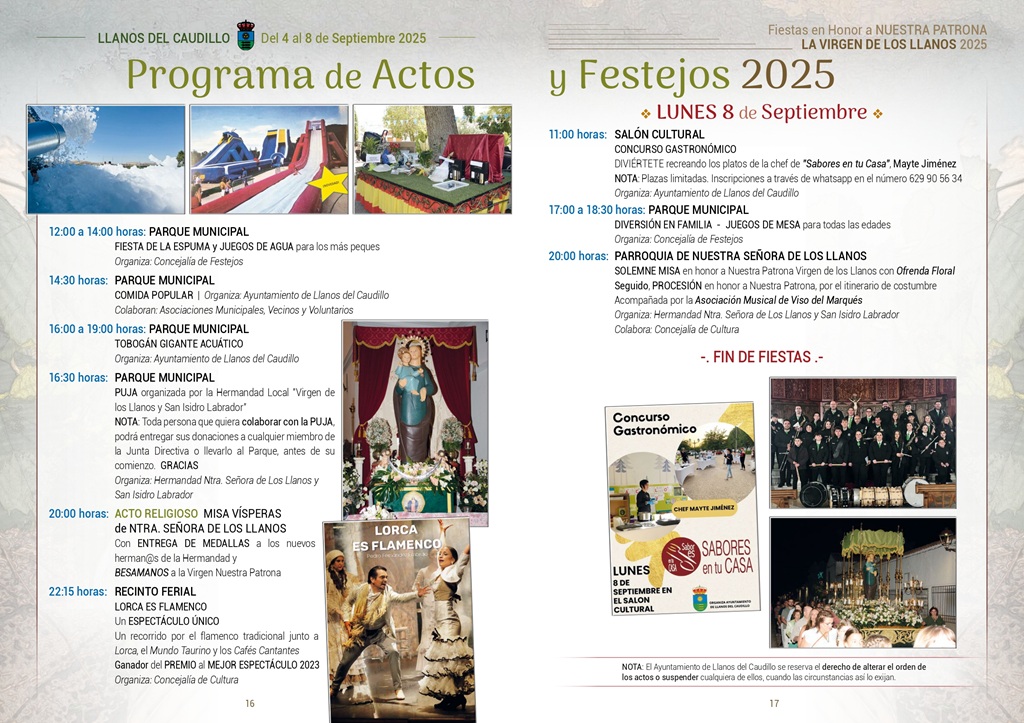 Por la tarde, la programación se traslada al ámbito religioso y cultural. “Tendremos la puja y la misa de vísperas, y después uno de los espectáculos más esperados: ‘Lorca es flamenco’, un montaje muy especial que ha recibido premios de importancia; también destaca el concurso de cocina de Maite Jiménez”, destaca Andrés Arroyo.