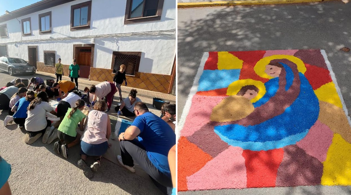 Anteriormente, por la mañana, las calles fueron engalanadas por muchos miembros de la parroquia como representantes de las Hermandades de San Antón, San Gregorio Nacianceno e Inmaculada Concepción, catequistas y jóvenes de la parroquia, integrantes del grupo de liturgia y del coro parroquia y decenas de vecinos y vecinas, que realizaron numerosas alfombras de sal, pusieron en las ventanas los diferentes estandartes, banderas y demás decoración, y llenaron las calles de flores y tomillo.