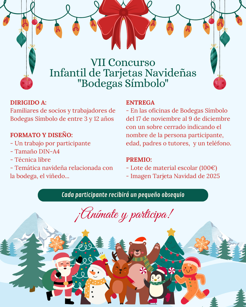 El Concurso Infantil de Tarjetas Navideñas contempla un premio principal consistente en un lote de material escolar valorado en 100 euros, además de que la tarjeta ganadora será la imagen de la felicitación navideña oficial de la bodega en 2025. Como incentivo adicional, la organización ha anunciado que todos los participantes recibirán un pequeño obsequio.