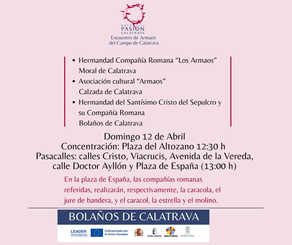 El encuentro contará con la participación de la Hermandad Compañía Romana «Los Armaos» de Moral de Calatrava, la Asociación cultural «Armaos» de Calzada de Calatrava, y la Hermandad del Santísimo Cristo del Sepulcro y su Compañía Romana, que actuará como anfitriona. La jornada dará comienzo a las 12:30 horas con la concentración de todas las compañías en la Plaza del Altozano. Desde allí, se iniciará un vistoso pasacalles que recorrerá las calles Cristo, Viacrucis, Avenida de la Vereda, calle Doctor Ayllón, para finalizar en la Plaza de España en torno a las 13:00 horas.