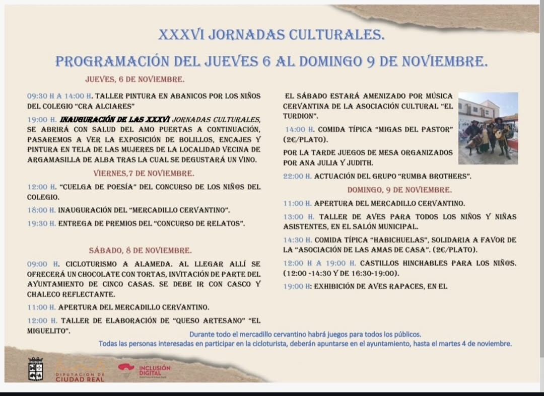 El jueves comenzará la programación con un taller de pintura en abanicos dirigido a los niños y niñas del colegio Alciares, seguido por la inauguración de las jornadas culturales, que tendrá lugar a las 19:00 horas. Durante el acto se inaugurará una exposición de bolillos, encajes y pintura en tela realizada por las mujeres de la vecina localidad de Argamasilla de Alba, que concluirá con un vino de honor para los asistentes.