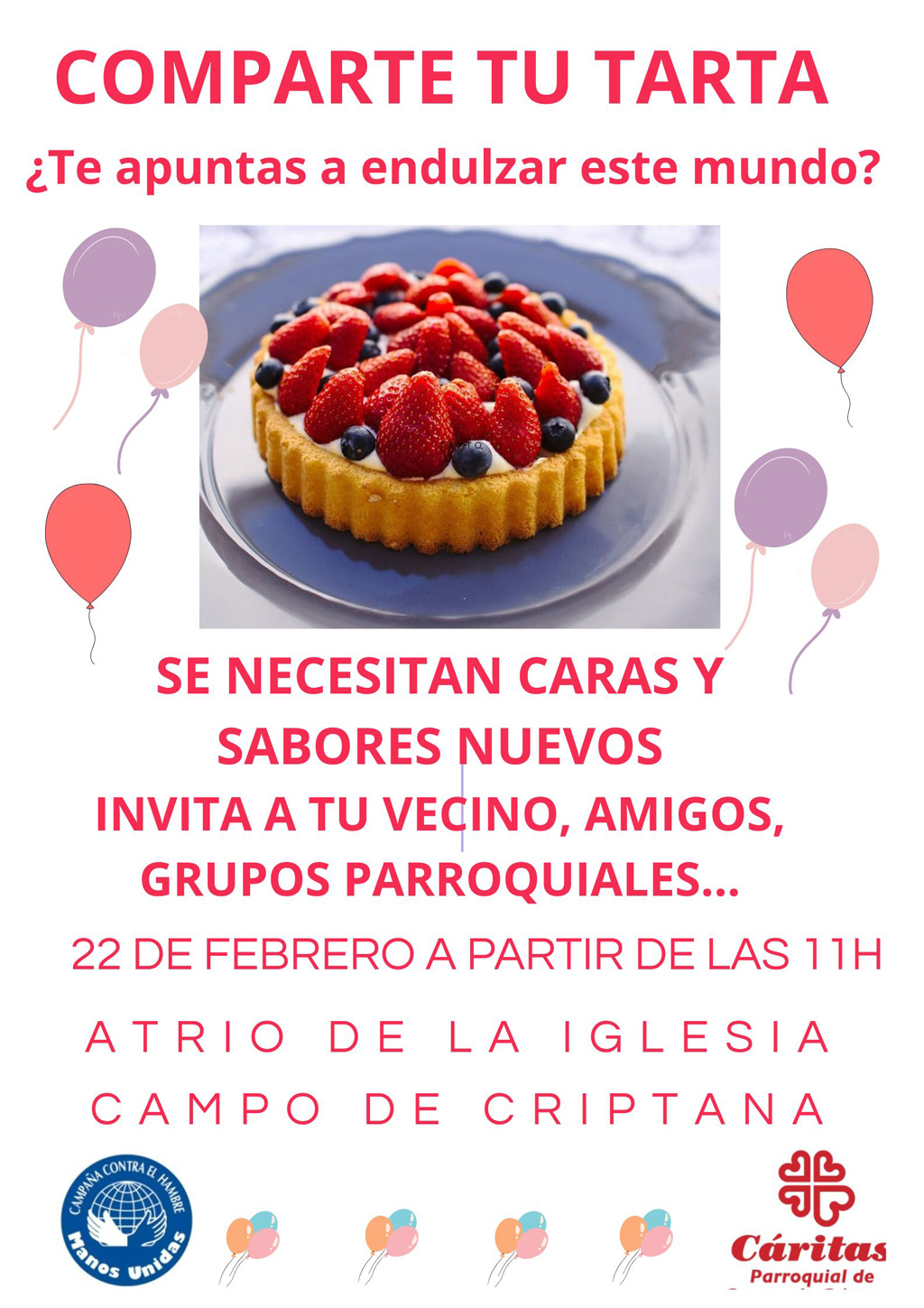 La Campaña contra el Hambre de Manos Unidas sigue su programación en Campo de Criptana. Este domingo la cita es con la actividad “Comparte tu tarta” que organiza Cáritas Parroquial de la localidad.