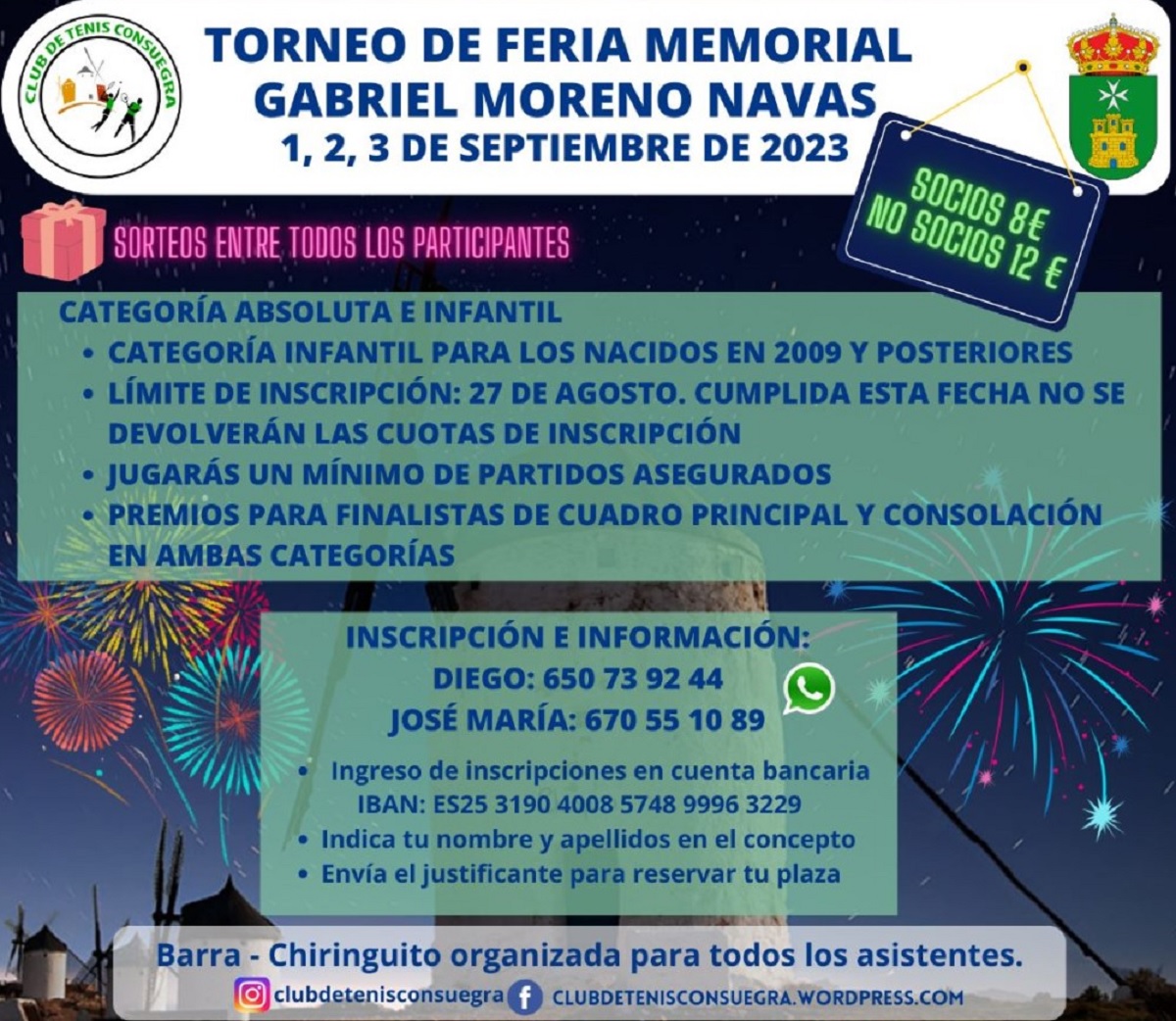 El Club de Tenis de Consuegra, con la colaboración del Excmo. Ayuntamiento de Consuegra, ha organizado del 2 al 4 de septiembre el «Torneo de Tenis de Ferias» 2023 «Memorial Gabriel Moreno Navas». Estos son todos los datos respecto a la