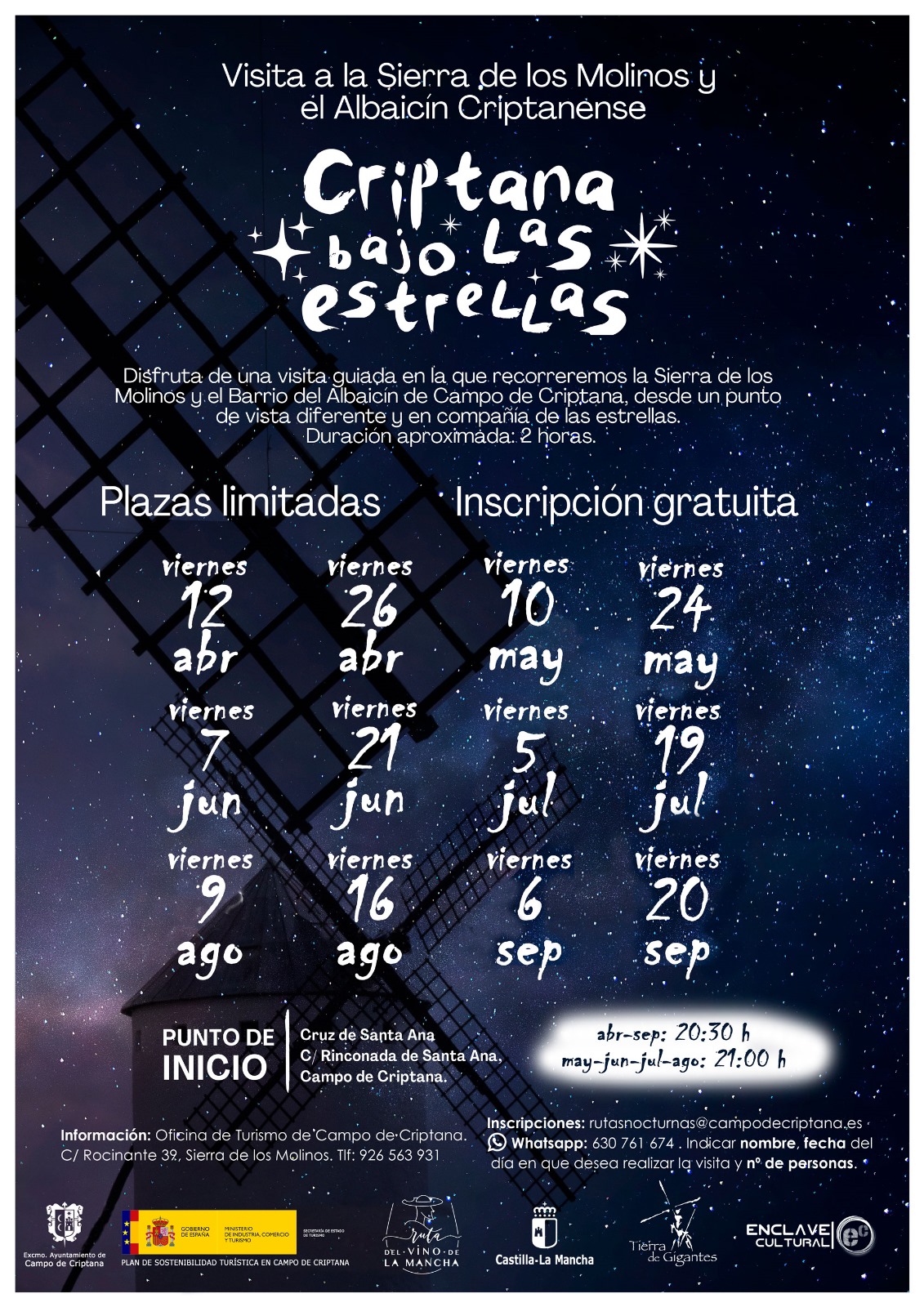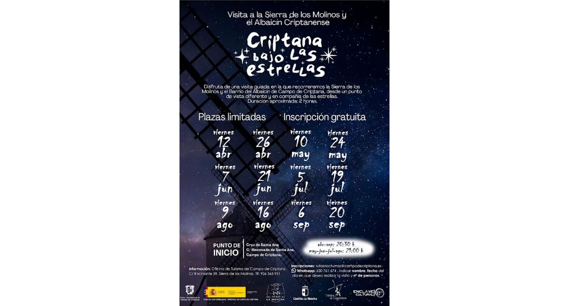 Estas rutas son gratuitas y con plazas limitadas, por ello, desde la Concejalía de Cultura se anima a realizar la inscripción previa y la reserva de la plaza a través del correo electrónico rutasnocturnas@campodecriptana.es o mediante WhatsApp al número 630 761 674, indicando el nombre, la fecha en la que se desea realizar la ruta y el número de personas.