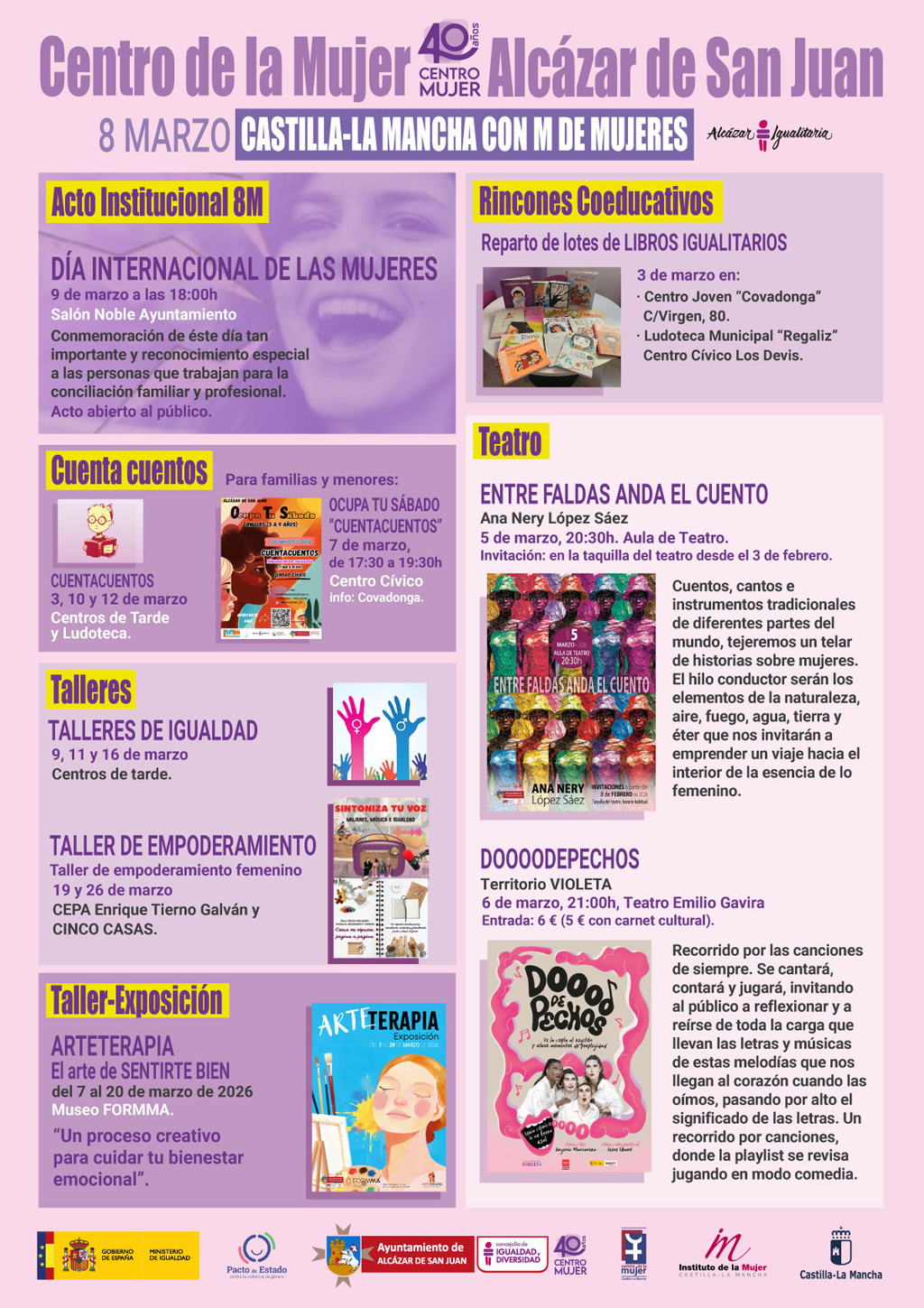 - Cultura y Empoderamiento: Exposiciones dedicadas a las mujeres sufragistas, talleres de vida sana para mayores y muestras culturales específicas que ponen en valor el papel femenino en el arte y la literatura.