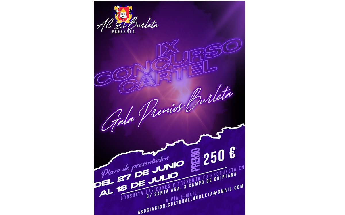 Las bases del IX Concurso del Cartel pueden consultarse en la página oficial del Burleta en Facebook: “Asociación Cultural El Burleta” y en caso de duda, pueden ponerse en contacto con la Junta Directiva a través de Facebook o del correo: asociacion.cultural.burleta@gmail.com
